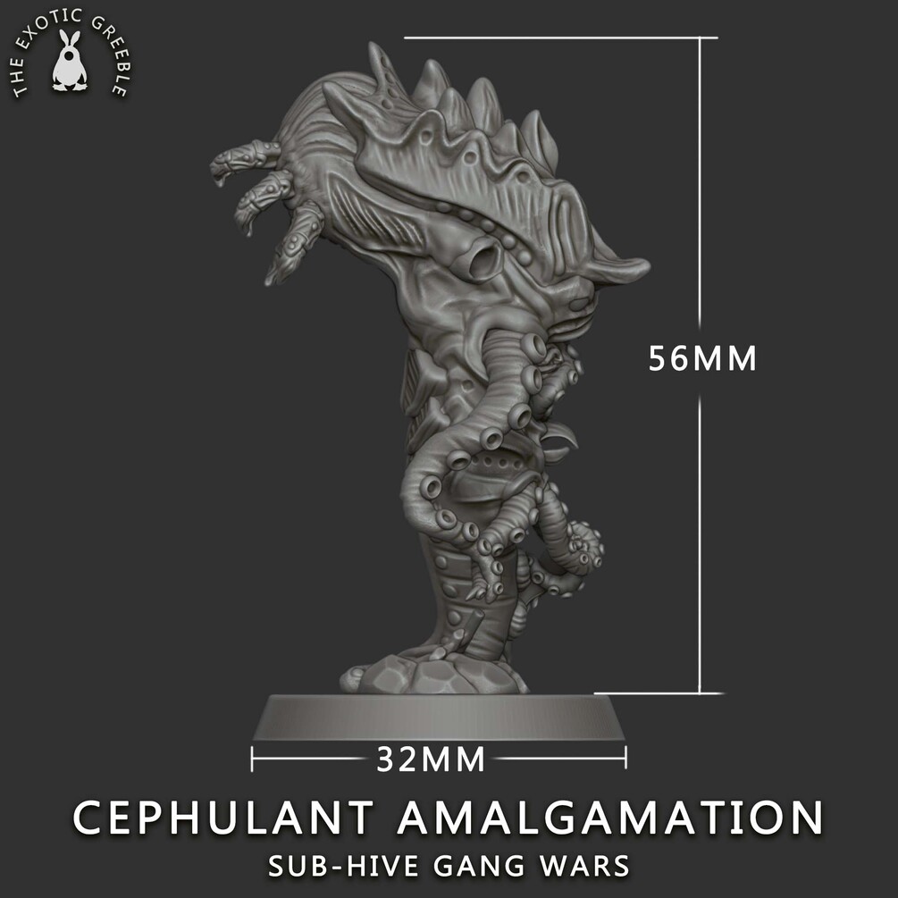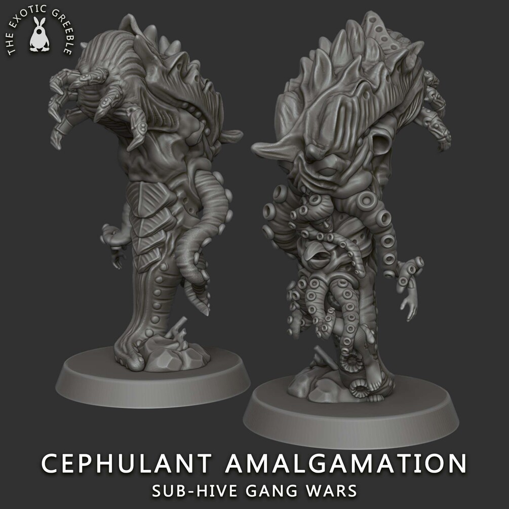 The Cephulant Amalgamation is a highly evolved proto-organism with frightening telepathic abilities. Squelching out from the lower-level sewers on malformed tentacles, it seeks a victim from which it can siphon memories and wear as a skin to “blend in”. During its formation, this creature grows in repulsive quantities of toxic chemicals, refinery waste and radioactive material. This allows it to constantly change shape and adapt to new environments with ease.