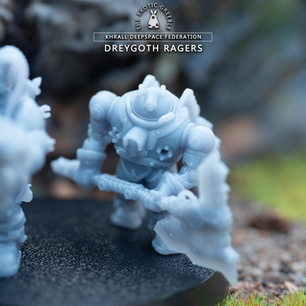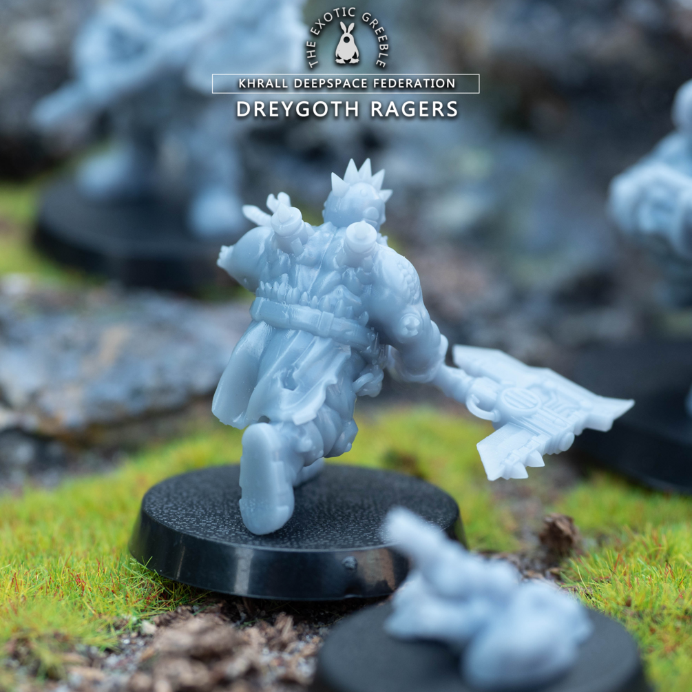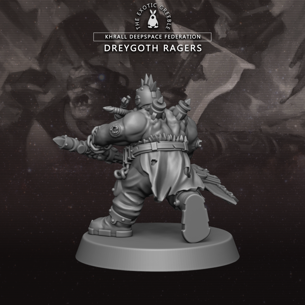Dreygoth Ragers are the most savagely augmented of the Voidborn, their bodies bio-grafted with potent chemical injectors. Once basic Voidborn Warriors, they now wield Plasma weapons and Impulse Gauntlets whose heavy heads carry a dark stain. Swarms of Earthsplitter Grenades burrow through steel and stone before erupting in ruin, opening enemy bastions like seams of ore. A faint corruption clings to their augmetics—a whisper in the circuitry that marks them as more than mere frontline warriors.