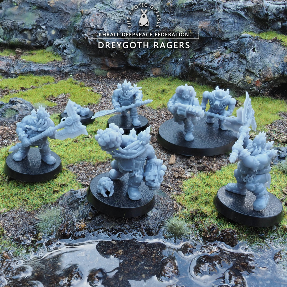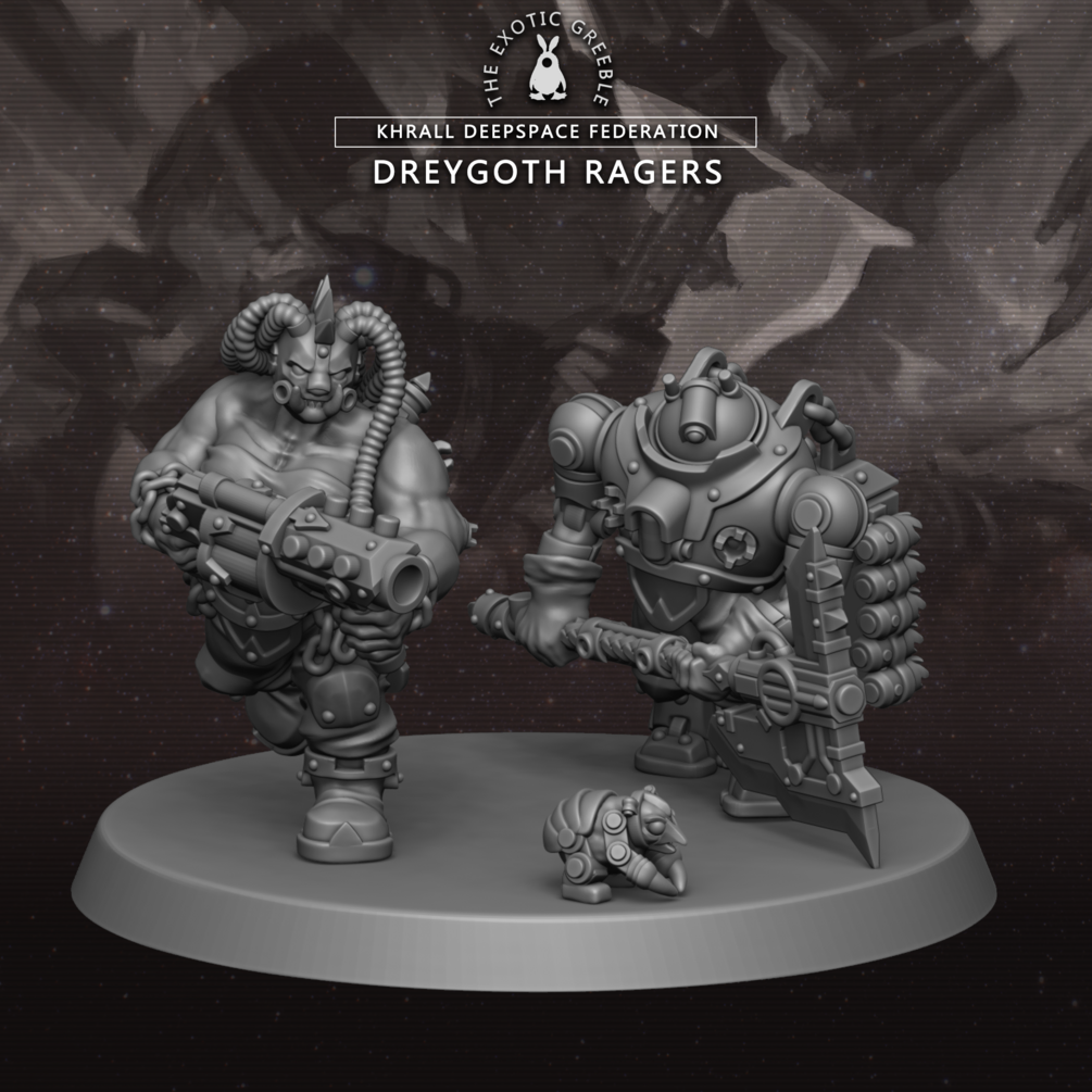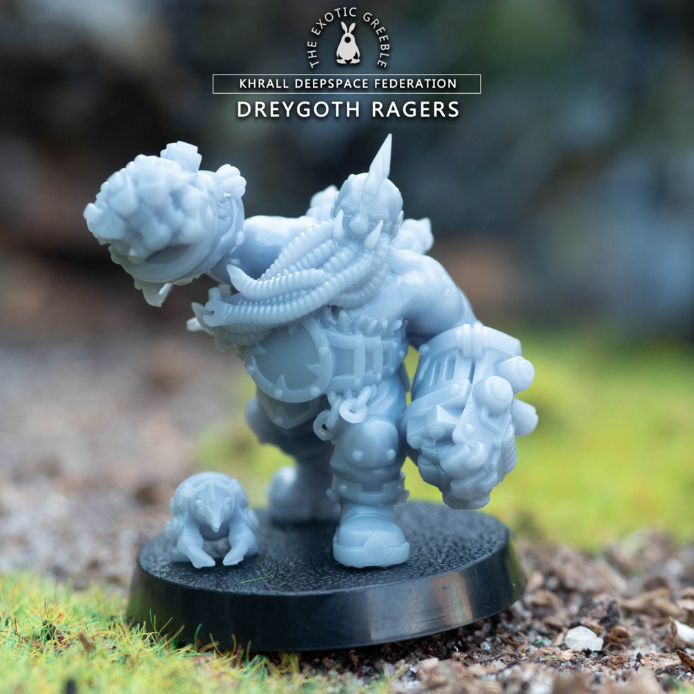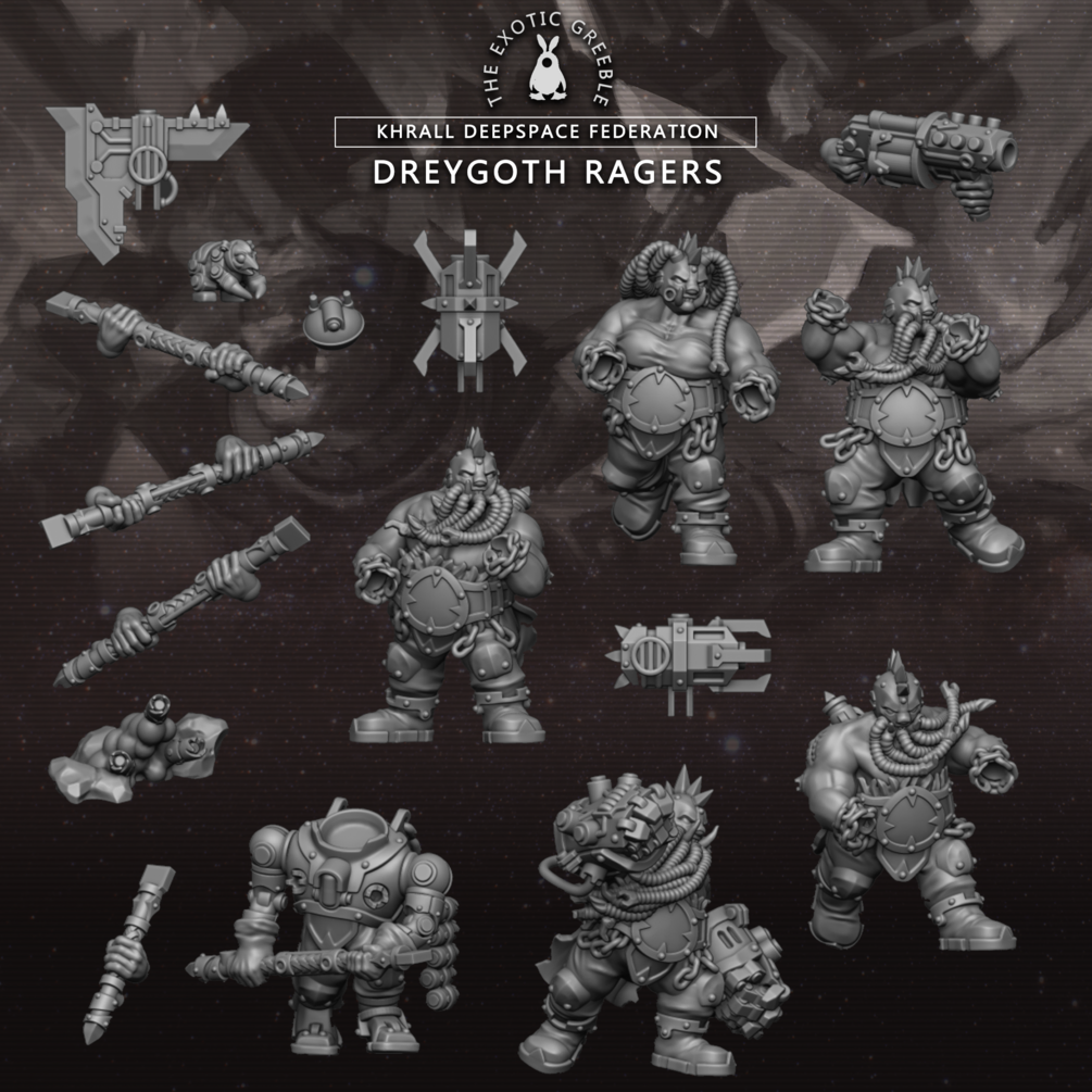 Dreygoth Ragers are the most savagely augmented of the Voidborn, their bodies bio-grafted with potent chemical injectors. Once basic Voidborn Warriors, they now wield Plasma weapons and Impulse Gauntlets whose heavy heads carry a dark stain. Swarms of Earthsplitter Grenades burrow through steel and stone before erupting in ruin, opening enemy bastions like seams of ore. A faint corruption clings to their augmetics—a whisper in the circuitry that marks them as more than mere frontline warriors.
