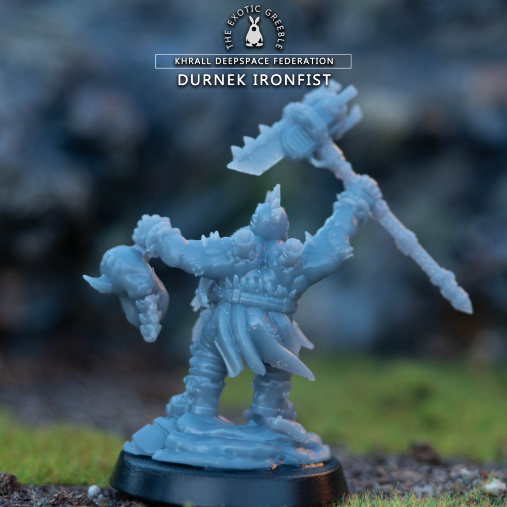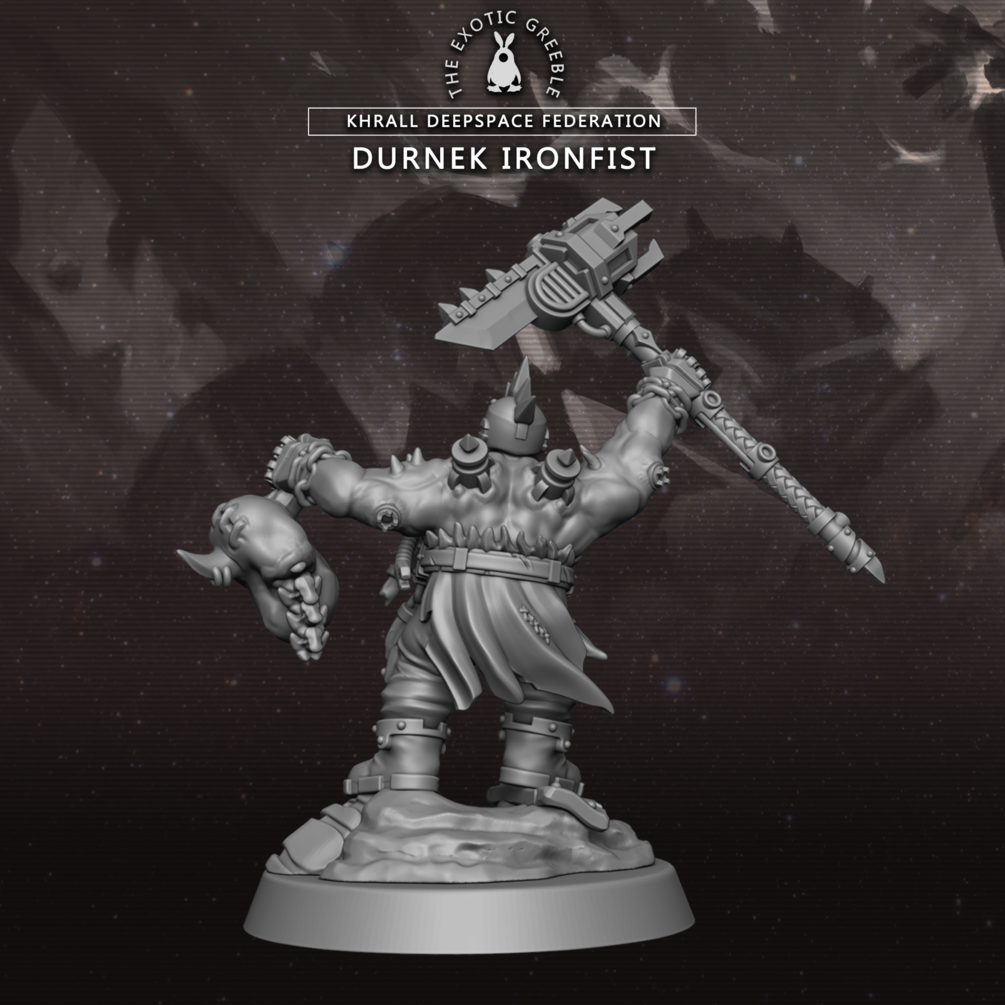 Durnek Ironfist is no mindless berserker, though his wrath in battle is the stuff of saga and song. Beneath the thunderous fury of his strikes lies a commander’s precision — a forge-tempered intellect that has led his Voidborn warbands of Dreygoth Ragers to shatter Ork uprisings time and again. For these victories, he bears the storied title of toothbreaker, a name spoken with reverence among the Leagues and with venom among the greenskin hordes.